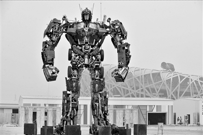 昨天上午,一座高度達(dá)到近10米、由廢舊材料拼裝成的“變形金剛”悄然現(xiàn)身于鳥巢北側(cè)廣場(chǎng)。這個(gè)大家伙來自臺(tái)灣,是目前國內(nèi)最高的變形金剛,將展出到10月10日。