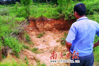 “又地陷了!”今年6月初,龍門縣龍?zhí)舵?zhèn)楊屋村村民再次發(fā)現(xiàn)村周邊的山地發(fā)生地陷時,不安蔓延整個村莊。該村村民稱,從1992年開始,距離村莊約1.5公里外的鉛鋅礦開采后,農(nóng)田、果場等不斷出現(xiàn)地陷。