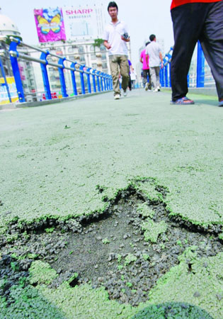 記者問:天橋剛修成僅一個(gè)多月,為何會(huì)出現(xiàn)大面積破損現(xiàn)象。張成立說(shuō),該路段交通異常擁堵,天橋工期趕得非常緊!坝捎谛腥艘^橋,影響了施工,所以上面本來(lái)要噴的一層固化膠就缺少了,以致地墊黏合性差,F(xiàn)在,我們要在上面再噴固化膠!
