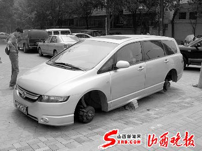 今天(17日),太原市和平北路與漪汾街附近,一輛停在路邊的本田商務車引來眾多市民圍觀。這輛車的4個輪子全被卸掉,無法行駛。