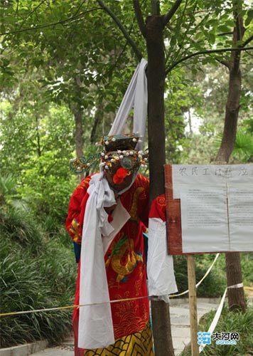 身穿大紅袍,頭戴金冠,脖子套在白布綾挽成的結(jié)上。7月23日下午16時(shí)許,鄭州市紫荊山公園內(nèi)一棵大樹(shù)下,一男子扮成一“財(cái)神爺”模樣欲“上吊”尋短見(jiàn)討回農(nóng)民工血汗錢(qián)。