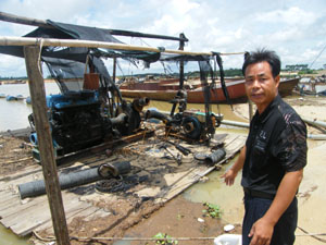 昨天上午11時許,記者與梁先生一同到現場了解情況。梁先生的金江沙場位于定安定城鎮(zhèn)和海口新坡鎮(zhèn)交界處,已經暫停作業(yè),工人們在工棚休息。記者在采沙船被毀現場看到,采沙船擱淺在岸邊,采沙機器完全被毀,電池燒焦,木板千瘡百孔,表面被大火熏得烏黑,內部零件完全破壞。雖然距離案發(fā)已有10余天,當時大火熊熊燃燒的情景依然可以想見。