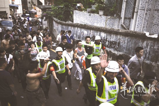 昨日下午2時(shí),羊城晚報(bào)記者接到報(bào)料迅速趕往現(xiàn)場(chǎng)見到,圍觀的人群布滿在各個(gè)警戒線的周圍,現(xiàn)場(chǎng)停了十幾輛警車和消防車,數(shù)十名警察和消防人員聚集在樓下商量對(duì)策。