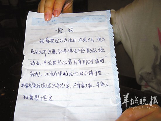 過了半個(gè)小時(shí)之后,施某提出要吃東西!八呀(jīng)三天沒有吃東西,三天來他從沒下過樓,想起來我就心疼!庇谑鞘惣严聵琴I了兩個(gè)盒飯帶上去了!霸谶@段時(shí)間,我勸他:警察殺你很簡(jiǎn)單,為什么不投案自首呢?如果自首他們會(huì)保證你的安全,如果你不放心,我們可以和他們簽一份協(xié)議!笔惣严蛴浾叱鍪井(dāng)時(shí)協(xié)議的草稿,據(jù)施麗佳稱,協(xié)議的主要內(nèi)容為施某投案自首,警察保證他的安全,并根據(jù)自守的情節(jié)向法院求情。
