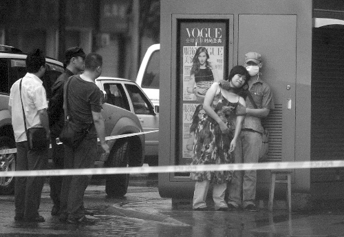 歹徒背靠書報亭,站在屋檐下,右手持刀抵住女人質的脖子,左手牢牢拽住后者的手臂。警方隨即在現(xiàn)場拉起警戒線,為避免刺激歹徒的情緒,又及時疏散了圍觀的群眾。