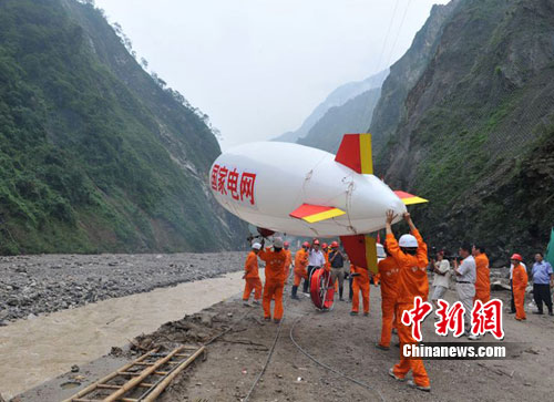 由于架設(shè)該段架空線路需橫跨綿遠(yuǎn)河,線路與河水最大高差達(dá)68米,且河水湍急,按照傳統(tǒng)施工作業(yè)方式根本無法進(jìn)行。為盡快搶通架空線路恢復(fù)災(zāi)民永久性供電,國家電網(wǎng)四川省公司調(diào)集綿陽、樂山、德陽等地的電力搶修人員共計(jì)160余人現(xiàn)場聯(lián)合奮戰(zhàn)。