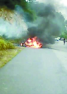 當(dāng)車(chē)隊(duì)開(kāi)到余姚梁弄的一條鄉(xiāng)鎮(zhèn)公路上時(shí),其中一輛法拉利跑車(chē)車(chē)后的發(fā)動(dòng)機(jī)突然冒出了大量濃煙。隨后整個(gè)車(chē)子開(kāi)始熊熊燃燒,不到半個(gè)小時(shí)就燒得只剩下個(gè)底盤(pán)框架,幸虧發(fā)現(xiàn)及時(shí),沒(méi)有人員傷亡。