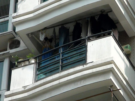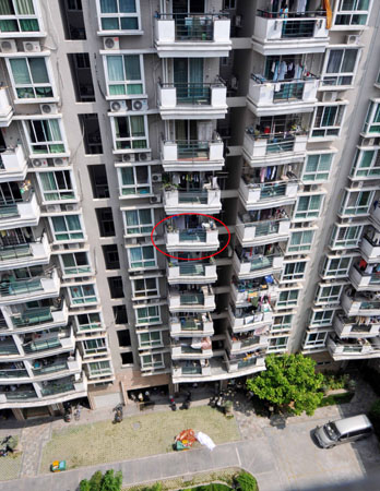 住在小區(qū)2號樓的老王目擊了整個過程!八敃r半蹲著,雙手緊抓著陽臺護欄,雙腳踩在陽臺外側(cè)的邊沿上!崩贤跻贿吥7履凶赢敃r的姿勢,一邊說,“他嘴里一直在喊救命,小區(qū)門口的保安聽到后趕緊往那邊跑,我也趕過去想幫助救人。保安剛到樓下,那小伙子的左腳突然滑下來,他往上蹬了幾下,沒蹬上去,右腳也跟著滑了下來,僅靠雙手抓住護欄。沒幾秒鐘,人就摔了下來!