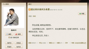 楊林川表示,需要說明的是,他在博文中建議定罪的炒房指的是炒房團,是集團性的整個單元、整幢樓購買的行為,這種行為足以影響市場的發(fā)展。而寫博文的第一個目的是告訴大家炒房不是光榮的事!霸诰W上搜索炒房,跳出來最多的是‘炒房技巧研討’、‘專家教你炒房’,還有人炫耀炒房賺了多少錢。倒火車票的黃牛人人喊打,而炒房怎么卻成了光榮的事。炒火車票的黃牛只是讓我們一時回不了家,可炒房的人卻讓我們永遠沒有了家。”