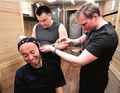 王躍(左一)在模擬艙內進行腦電極試驗。俄羅斯生物醫(yī)學問題研究所供圖