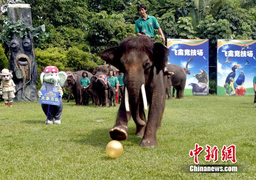 陣容最強大的壓軸方隊是10只大象,它們參加了運動會的球類項目,比賽現(xiàn)場擺了4個大氣球,大象向著觀眾席大腳一踢,觀眾都不自覺地當(dāng)起守門員,穩(wěn)穩(wěn)地把球接住。