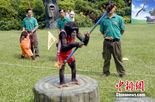 緊接著出場的是猩猩方隊,5只猩猩穿上運動裝,精神抖擻。為了表現(xiàn)訓(xùn)練成果,他們迫不及待地點起熊熊火棒,觀眾看得驚險萬分,可這些猩猩運動員卻舞得從容自在。隨后,黑猩猩跟黃猩猩還進行了一場拔河比賽。