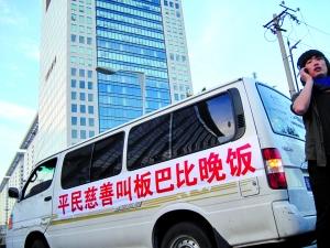 發(fā)起人之一王一飛的朋友透露,巴比晚宴可能在盤古七星酒店舉行,便一路駕車來(lái)到盤古大觀,車上的“平民慈善叫板巴比晚飯”字幅,引起路人圍觀。