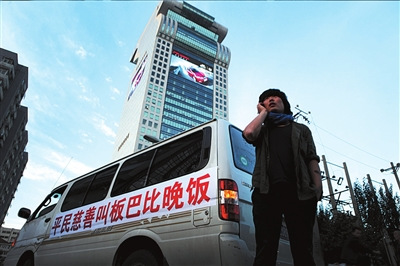 “平民慈善叫板巴比晚飯。”昨天下午5點(diǎn),朝陽區(qū)北四環(huán)中路盤古大觀酒店樓下,一輛白色面包車身上的挑釁口號引得周圍市民駐足觀看。