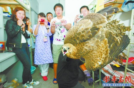9月28日傍晚 6時(shí)許 ,青島大學(xué)美術(shù)學(xué)院的女生小劉下課后回到宿舍,剛走進(jìn)宿舍門,一只鷹從陽(yáng)臺(tái)飛進(jìn)屋內(nèi)朝她撲來(lái),嚇得她失聲尖叫沖到門外。這只鷹在屋內(nèi)東闖西撞,墻壁上留下了斑斑血跡,隨后趕來(lái)的男生將它抓住。29日下午,青島市動(dòng)物園動(dòng)物管理科的專家來(lái)到宿舍將受傷的鷹帶走,經(jīng)鑒定這只鷹是國(guó)家二級(jí)保護(hù)動(dòng)物——蒼鷹,工作人員將會(huì)在其傷情痊愈后擇日放生。
