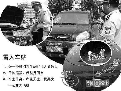 更讓民警哭笑不得的是,該車車身還貼滿了諸如“干掉熊貓我就是國(guó)寶”、“做—個(gè)徘徊在牛A和牛C之間的人”、“車主單身,名花無(wú)主,找美女—起看大飛機(jī)”等雷人標(biāo)語(yǔ)。(記者黃廣華通訊員侯明輝)