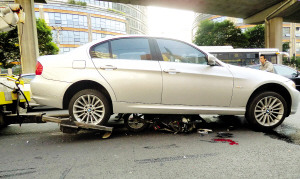 據(jù)目擊者介紹,事發(fā)時(shí),這輛牌號(hào)為滬H的銀灰色寶馬轎車(chē)沿曲陽(yáng)路由北向南行駛,至東體育會(huì)路附近時(shí)與一輛電瓶車(chē)發(fā)生碰撞。電瓶車(chē)被撞倒,騎車(chē)的中年男子當(dāng)場(chǎng)倒地。30多歲的女司機(jī)在慌亂中或許錯(cuò)將油門(mén)當(dāng)成了剎車(chē),轎車(chē)猛沖向前,將電瓶車(chē)一路往前推行數(shù)米遠(yuǎn)。最終,男子連人帶車(chē)被卷入轎車(chē)底盤(pán),轎車(chē)則卡在電瓶車(chē)上,后輪騰空,車(chē)身動(dòng)彈不得。