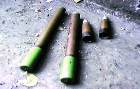 正在這時(shí),劇組那名工作人員發(fā)現(xiàn)了異樣。在一個(gè)堆著啤酒瓶、廢紙的地方,有4根鐵的條狀物很是怪異:長(zhǎng)的2根有1尺多長(zhǎng),一頭是綠色的,一頭是棕色的;另外2根很短,是圓錐體,尖上是白色的,身體是棕色的,尾部又是黑色的!鞍⊙,這里有火箭彈!”這員工一聲喊,把周圍的人嚇了一大跳。