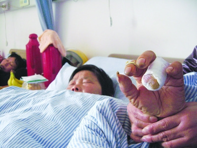 昨天中午,記者在高淳縣人民醫(yī)院見到了邢老太,她此時躺在病床上,正在掛水,面色異常蒼白,一旁的女兒雙眼通紅,不住地撫摸母親的手臂!罢媸翘^分了,他們能這樣對待一名老人嗎?”女兒哭著告訴記者,那少了的一節(jié)手指就是被城管隊員硬生生扯斷的。