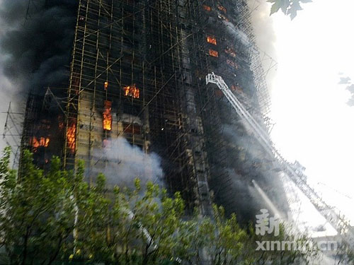 16時20分,大火持續(xù)了兩個多小時還未被撲滅,大樓內(nèi)仍有居民尚未逃出,頂樓還有不少被困居民在等待救援。新民網(wǎng)記者在現(xiàn)場看見,經(jīng)過大火猛烈的炙烤,已經(jīng)有腳手架在往下掉落了,現(xiàn)場十分危險。