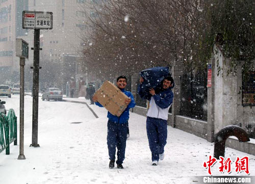 記者在烏魯木齊街頭看到,道路上的行走較往日減少,因?yàn)樘炖渎坊,市民大多都擠上了公交車,還有人焦急地等待出租車。到中午11點(diǎn)時(shí),雪花開(kāi)始變大,記者到外面拍照采訪,來(lái)回不到二十分鐘的時(shí)間里,記者身上落滿了一層雪花。