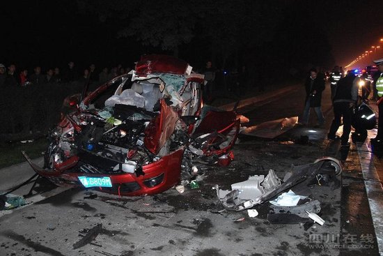 昨晚10時(shí)許,成都晚報(bào)記者趕到現(xiàn)場(chǎng)時(shí),交警正在勘查事故現(xiàn)場(chǎng),周?chē)鰸M(mǎn)了碎片。