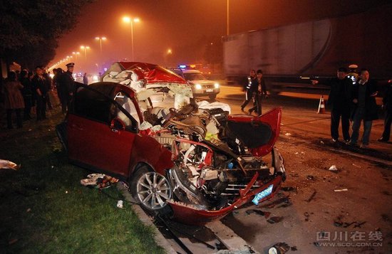 昨晚(25日)9時(shí)許,三環(huán)路南三段,一輛載了8個(gè)人的紅色世嘉與一輛大卡車(chē)發(fā)生嚴(yán)重追尾,車(chē)內(nèi)兩男一女當(dāng)場(chǎng)死亡,另外5人,包括兩名小孩傷勢(shì)不重,被送往市一醫(yī)院。