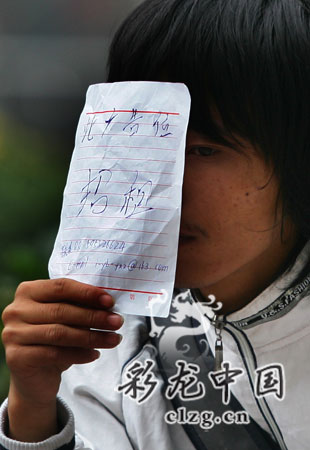 羞澀的表情,略亂的頭發(fā),穿一身白色衣服,旁邊擺一個(gè)旅行包。這個(gè)臉上還有著稚氣的小伙子,用蹩腳的普通話指著紙上的字,有些不好意思地說:“寫得很不好!笔峙e一張紙遮住臉,上面是他自己用鋼筆寫的“此廣告位出租”6個(gè)大字,右下角留的小字標(biāo)有自己的QQ號(hào)和電子郵址。