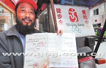 10月21日下午,“徒步中國,宣傳奧運(yùn)”的湖北宜都人李春華在貴陽河濱公園,向記者展示國家奧組委和他所到地區(qū)政府給他的題詞以及加蓋的公章。今年45歲的李春華,2000年12月26日從云南西雙版納開始實(shí)施自己多年的夢想,徒步全國,宣傳奧運(yùn)。七年間,李春華歷經(jīng)風(fēng)雨和苦難,足跡遍及大半個(gè)中國,預(yù)計(jì)23日從貴陽離開前往云南,走完這一行的最后一段。