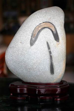 無獨(dú)有偶,當(dāng)日下午1時(shí)許,記者在西固區(qū)河口鎮(zhèn)的張先生家中也看到了一塊類似的黃河奇石,不同的是該黃河石的體形稍大,呈淡褐色,黃河石正面上部有一個(gè)直徑約4厘米的銀色滿月,滿月的左下方有一顆衛(wèi)星在做繞月飛行,而且繞月軌道清晰可見。張先生告訴記者,大約一年前,他從一位石友處發(fā)現(xiàn)了這塊黃河石,當(dāng)時(shí)覺得挺普通,并沒在意。最近電視、報(bào)紙連續(xù)報(bào)道“嫦娥”奔月的相關(guān)消息,他突然發(fā)現(xiàn)這塊黃河石頗似衛(wèi)星升空后繞月飛行的場景,便從那位石友處高價(jià)購得。(記者 王少丹)