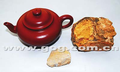 為了證實(shí)此壺真?zhèn)危蹴槹l(fā)還專門贈(zèng)送駱先生制壺原礦兩塊(見圖),同時(shí)在收藏證中提到并以此為證。在上?萍汲霭嫔绯霭娴摹蹲仙皦罔b賞寶典》一書中記者看到,圖中大塊的原礦叫石黃心,小塊的叫大紅泥礦,兩者按照一定比例混合則成大紅袍泥,此泥產(chǎn)于宜興市黃龍山,泥質(zhì)細(xì)膩密度大,屬十分稀有泥類,是制宜興紫砂壺頂級泥料。