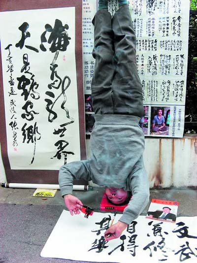 頭頂?shù),腳朝天,左手端硯,右手運(yùn)筆,隨著他的手臂移動(dòng),筆走龍蛇間,“戰(zhàn)勝自我”四個(gè)大字躍然紙上。昨日,在清水塘古玩市場(chǎng)內(nèi),一位來(lái)自常德桃源的59歲老人當(dāng)眾展示倒立揮毫的絕活,引來(lái)現(xiàn)場(chǎng)一片嘖嘖稱奇聲。