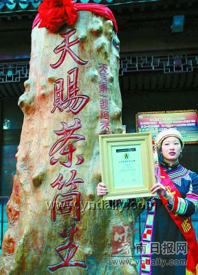 記者看到大茶筒上面刻有“天賜茶筒王”字樣,把茶放到這么高的茶筒里,要取茶方便嗎?工作人員從茶筒的下方打開了一道小門,里面的小茶坨就滾了出來,一點(diǎn)都不麻煩。當(dāng)天,上海大世界基尼斯總部給大茶筒頒發(fā)了“大世界基尼斯之最,最大的古樹茶筒‘天賜茶筒王’的證書”。