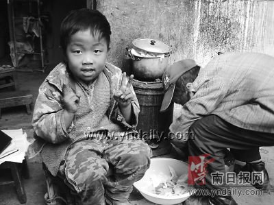 中午1時,是祖孫兩人的午飯時間,一碗清水煮白菜、一碟咸菜就是兩人的下飯菜!拔易钕矚g吃的東西就是腐乳拌飯,還有蘿卜、白菜……”問起珍珍最喜歡吃的東西時,她響亮地回答。給她照相時,她就沖著鏡頭做鬼臉,笑嘻嘻地比著V字形的手勢,天真無邪的樣子,讓人看了既心疼又心酸。