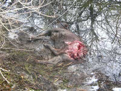 就在這時,動保處的同志接到電話:板石鎮(zhèn)孟嶺村五隊村民趙智國家的牛被咬死。經(jīng)查,11月9日,趙智國家一頭3個月的公牛失蹤,經(jīng)查找在距村屯2公里處的盤嶺溝發(fā)現(xiàn)牛已被咬死,牛的臀部已被吃掉。11月12日,管理局野生資源保護處工作人員認(rèn)定該牛確被野生東北虎咬死。