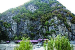 湯河溫泉有兩個(gè)泉眼,在河道西側(cè)山腳下,常年不停地冒熱水。上個(gè)世紀(jì)80年代末,當(dāng)?shù)卣畬⑷廴ζ饋硇顭崴ㄟ^管道流入修建的四個(gè)浴池里,供當(dāng)?shù)卮迕裣丛,后又在浴池上修建洗浴亭及長廊。