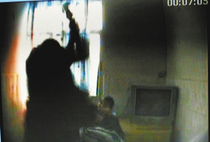 我馬上站起來,一只手跟他搏斗,一只手打開了防盜門,當(dāng)時(shí)的動(dòng)靜很大,外面接應(yīng)的同事也都聽見了,他們?cè)议T砸了五六下,門開了,沖進(jìn)來就控制了周某。