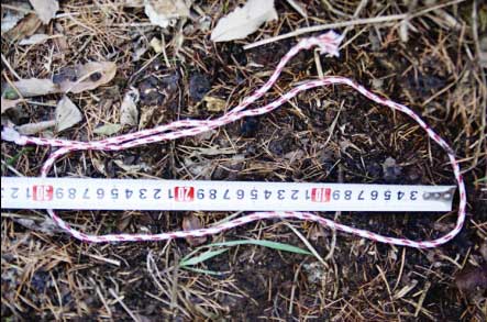 現(xiàn)場(chǎng)人員決定再?gòu)暮舆呏,查找可疑痕跡。調(diào)查人員發(fā)現(xiàn),在腳印左邊的灌木叢上,一根距地面1.2米高的樹枝擋住去路,其上3根小枝似乎被不明物體通過時(shí)絆動(dòng),因擠壓而折斷。地上有明顯不規(guī)則的連續(xù)腳印,步距1米多。在腳印繞過一塊大石頭的地方,他們發(fā)現(xiàn)落葉腐殖土上的一大一小、同向、前后相鄰的兩個(gè)腳印(非鞋印),且能夠分辨出均為左腳。由于時(shí)間有限,調(diào)查人員決定放棄用帶來的石膏灌制腳印模型,待后續(xù)處理。