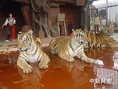 中新網(wǎng)順德11月22日電(孫建駒 謝俊忠)陜西省鎮(zhèn)坪縣農(nóng)民周正龍拍攝華南虎一事經(jīng)媒體廣泛傳播后,一時坊間沸沸揚揚,并引發(fā)“打虎派”和“挺虎派”的熱烈爭論,互聯(lián)網(wǎng)上更是“打虎”聲一片。在真假華南虎熱爭之際,廣東順德長鹿休閑度假農(nóng)莊馬戲團將3只東北虎的照片制成大小一樣的噴畫,準(zhǔn)備邀請網(wǎng)友與周正龍前來順德拍虎,然后比較真虎照與噴畫虎照的區(qū)別所在。
