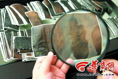 此后,劉先生和弟弟開車將保險柜拉到中國人民銀行西安分行營業(yè)管理部。該行貨幣金銀處的暢續(xù)達科長說:“當時老劉來咨詢時,我們看了保險柜內(nèi)的殘幣心里也沒譜,在和其他同事商量后,我建議老劉回家后,按照相關要求,先試著將殘幣粘貼一部分拿過來,我拿著樣品請示上級行后,再做能否兌換的決定。”