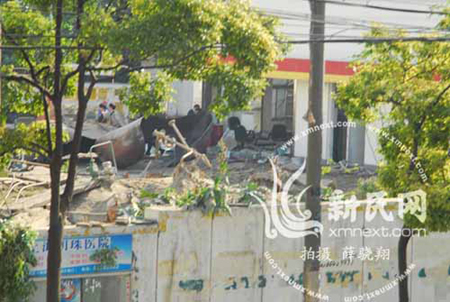 有目擊者稱,早上經(jīng)過加油站,突然聽一聲巨響,隨后看到有一人從加油站內(nèi)飛出,目測約有五層樓的高度,后掉落在馬路對面的店門口。