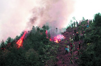 昨日上午9時(shí)許,大風(fēng)讓火勢再次蔓延。此時(shí),600多名增援的武警、消防戰(zhàn)士、民兵預(yù)備役戰(zhàn)士迅速投入到山火的撲救之中。寬25米、長1公里的隔離帶剛剛砍伐成功,迅猛的火勢立即就蔓延過來。到上午11時(shí),4條隔離帶相繼失守。常規(guī)的山火撲救方法已經(jīng)無法奏效,只得重新布置兵力。20米的隔離帶被拓寬到了25米,三組人員同時(shí)展開戰(zhàn)斗。記者在現(xiàn)場看到,附近許多村民已將自家的電視機(jī)、桌子、衣被等物什全部搬至空曠地。