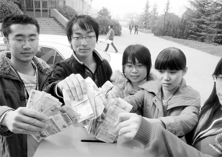 11月30日上午,西北工業(yè)大學(xué)明德學(xué)院的廣播里開始播放《陽光報(bào)》和西安騰訊網(wǎng)關(guān)于孔靜救母的報(bào)道,去飯?zhí)贸燥埖膶W(xué)生走到募捐處排起長隊(duì)捐錢,100元、50元、10元、2元,校友們紛紛將節(jié)省下來的錢投到募捐箱里,。一名大一女生抹著眼淚說:“一個(gè)剛畢業(yè)的大學(xué)生,遇到這種事情也太難了,每天少吃一個(gè)菜,也要為孔靜姐姐捐些錢。”30日下午,馬老師等人帶著全校師生的捐款14183.4元,送到了交大一附院的病房,孔靜不住地擦眼淚。