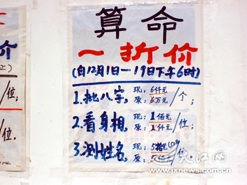 4日,按照熊先生提供的線索,記者在湯家園巷82號找到了這家自稱是“心靈垂詢室”小房子.房子大門緊閉并掛有一“大降價”的牌子,門的一側(cè)是“好消息”.屋主自稱李師祖,12月份是他的生日,所以他舉行了這次“一折價活動”;另一側(cè)墻面貼滿了諸如“算命一折價”、“風水一折價”等小紙片。記者查看了所有的紙片,“原價”最高的為6萬元,“一折價”后6千元。