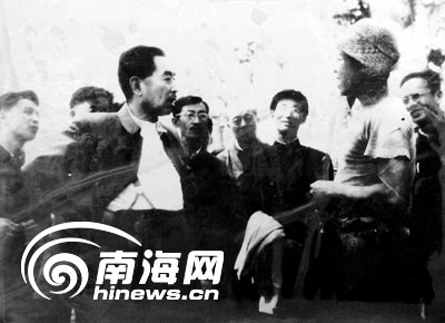 上午,身穿深灰色中山裝的周總理來到農(nóng)場橡膠園——這是儋縣愛國華僑1919年從南洋經(jīng)過千辛萬苦引種成功的,叫“天任”、“蔡惠”膠園,它是新中國發(fā)展橡膠主要的采種基地。