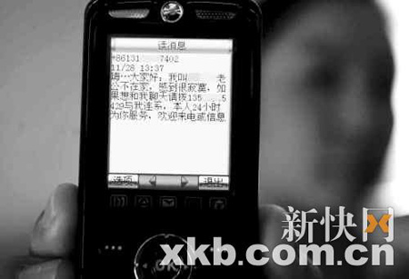 據(jù)稱,這個(gè)神秘的陌生人曾一度發(fā)短信息要求和郭小姐約會。見郭小姐不予理睬,對方又發(fā)些編造的短信給郭小姐的丈夫。“居然說我背著丈夫做對不起他的事,這純粹是誹謗!”郭小姐氣得咬牙切齒。