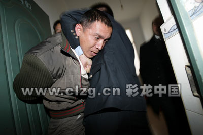 面對突然出現(xiàn)的法警,劉某似乎早有心理準(zhǔn)備,起身換好皮鞋準(zhǔn)備出門。然而,正當(dāng)法警準(zhǔn)備給劉某戴手銬時,站在一旁的劉某的妻子失聲哭了起來:“你們要帶他去哪兒啊?……”聽到妻子的哭聲,原來故作平靜的劉某開始激動起來:“我不是不讓你們銬,你們要戴手銬就銬在前面,不要銬在后面!”劉某一邊叫一邊和法警對抗著,而一旁的劉某妻子也跑到了丈夫身邊,拳打腳踢地試圖阻止法警帶走丈夫。但最終,3名法警還是將劉某的手銬上。