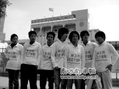 為了討到25萬元欠款,債主羅先生專門制作了8件專用“討債T恤”,讓8名男女員工各穿一件一字排開站在欠債方所在單位門前,并聲言“不拿到欠款決不收兵”。昨日上午,這一奇特的討債方式在長安鎮(zhèn)某學校門前上演。