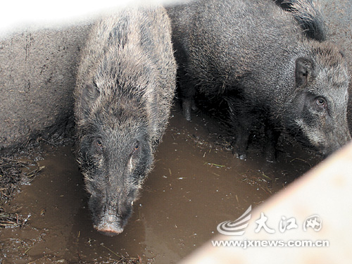 兩頭野豬一大一小。夏水華介紹說(shuō),大的是母的,約有125公斤,已經(jīng)養(yǎng)了8年多;小的那只是公的,約有75公斤,也養(yǎng)了3年多。