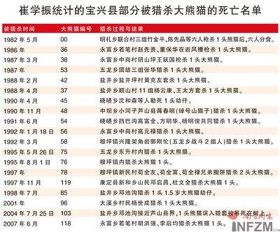 原寶興縣林業(yè)局局長、原四川寶興蜂桶寨國家級自然保護區(qū)管理局局長、大熊貓專家崔學振不完全統(tǒng)計,二十年間寶興縣就有20只大熊貓被獵殺。(見附表)